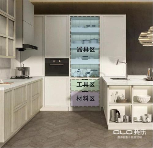 我乐橱柜在进行柜体设计时,会充分考虑用户的使用习惯和使用频率,对橱柜进行区域划分。比如,上层器具区可存放使用频率较低的各类锅具,下层材料区可存放使用频率较高的厨房小工具和调味材料,中间则是工作区,对橱柜进行合理的区域划分能最大限度方便用户存取。