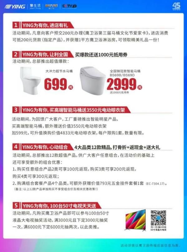 鹰卫浴第三届马桶文化节不仅是一场关爱久坐族、关爱消费者的活动,更是一场品质钜惠盛宴。8月17日至9月8日,一场声势浩大的关爱活动震撼来袭,全国1000多家专卖店同步启动,福利多多,惊喜不断。
