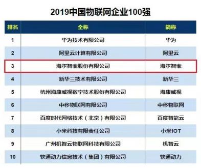 8月15日,《互联网周刊》&eNet研究院发布2019中国物联网企业100强榜单,华为、阿里、海尔位列前三,排在前十的企业还有新华三、海康威视、中移物联网、小米IOT等涉及物联网的企业。