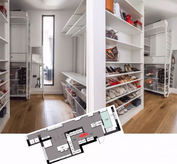 而且在玄关的边上就是一个步入式的衣帽间/储物间,两侧都做了开放式的隔板架和柜子,搭配一些置物盒和收纳袋,满足不同物品的收纳需求。