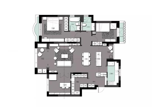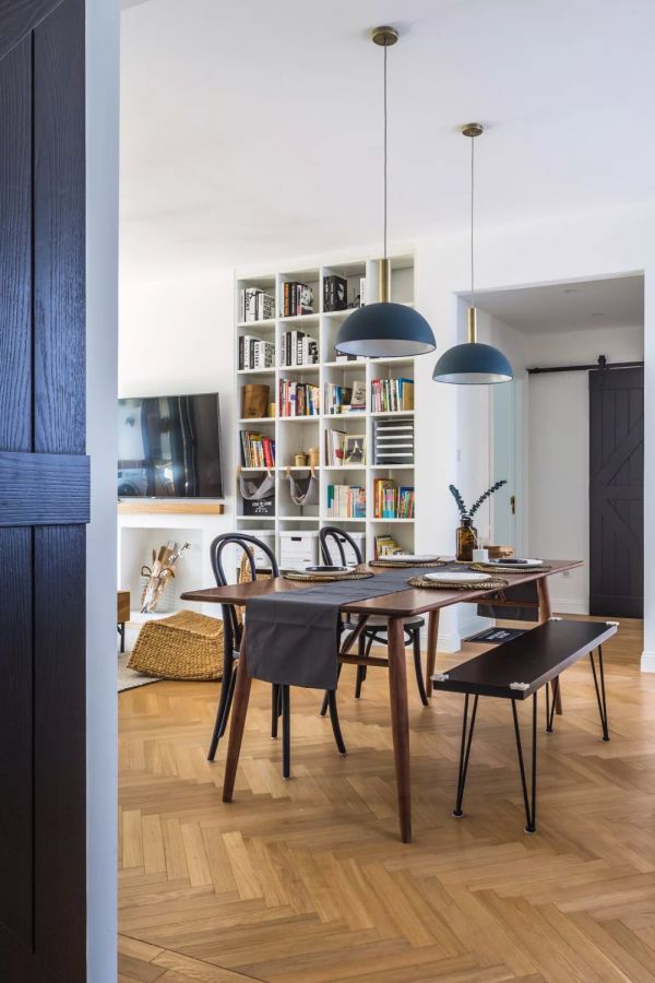 走过玄关到了客餐厅空间,餐桌椅的款式选择了略带复古风的那种,地面的木地板做了人字拼的设计,更有欧美古典风的感觉。客厅的电视背景墙两侧做了嵌入式的收纳设计。(ps:现在添加微信:qijiavh,即可预约全国300+城市的免费报价服务和量房设计!)