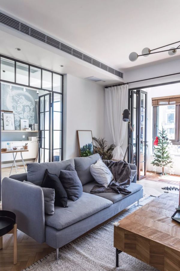 客厅的沙发选择了尺寸比较小的,让四周的通行空间变得更为宽松。客厅与书房、阳台之间都用黑框玻璃门作为隔断,让光线能够流通起来。