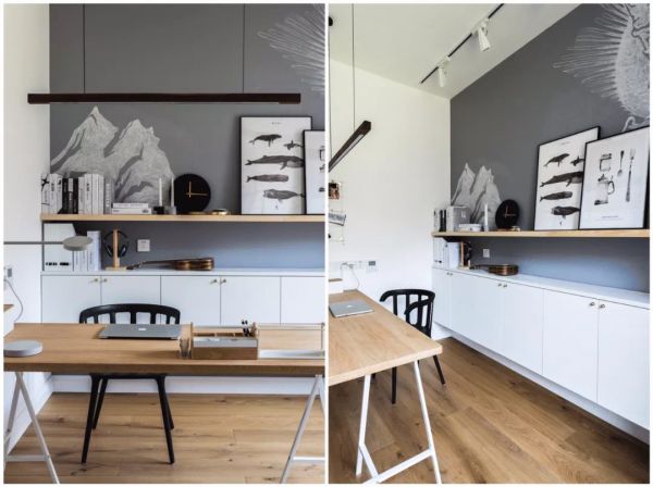 书房内摆放书桌椅和悬空的壁柜、隔板等,把墙面留出一部分可以避免书房看起来太拥挤,在这里工作的时候心情也会更好一些。
