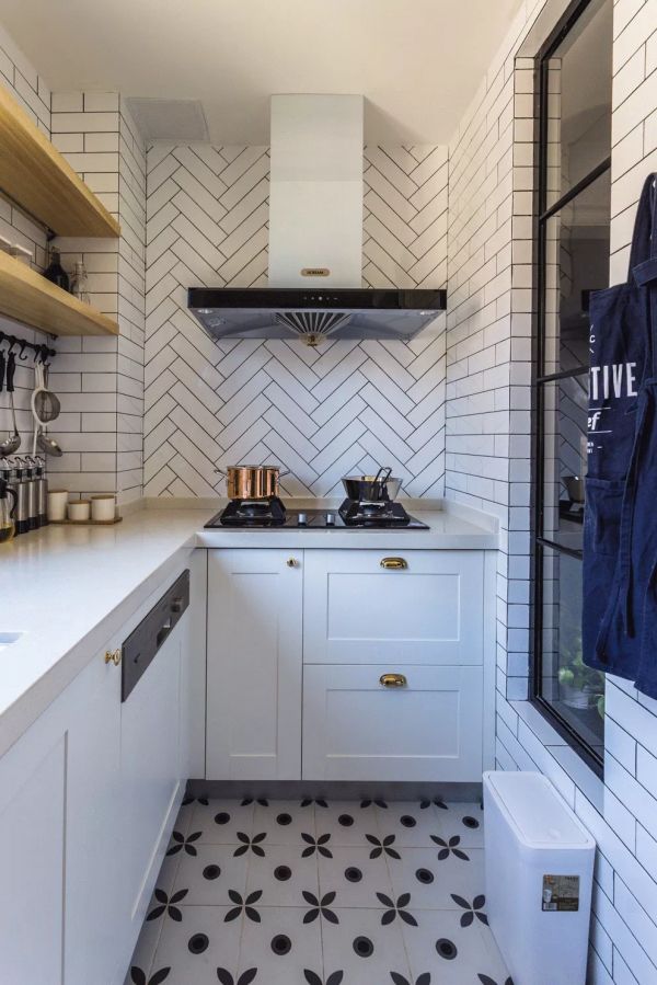 厨房的橱柜是做了L形的布局方案,冰箱摆放在了厨房的另一端,墙面创意铺贴的小白砖搭配地面的黑白花砖,看起来简洁又时尚。