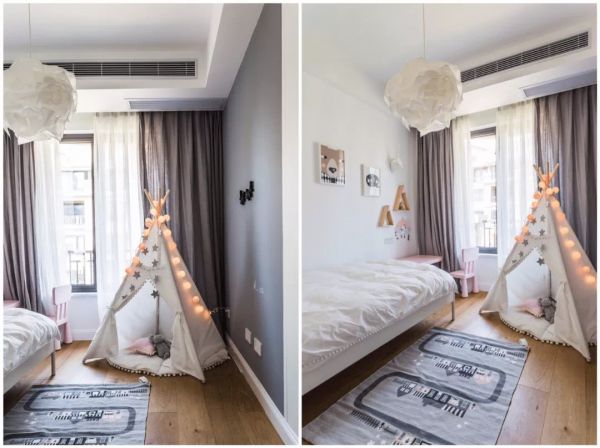 儿童房的设计比较趣味十足,在角落里摆放一个带有小串灯的帐篷和粉嫩的小桌椅。其中一侧的墙面更是做了黑板墙的设计,方便孩子涂涂画画。