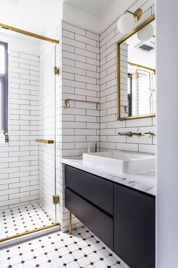 卫生间内做了干湿分离的设计,在浴室柜和淋浴房的细节处都加入了一些铜质金属元素,搭配黑白配的设计,给人一种简洁大方的感觉。