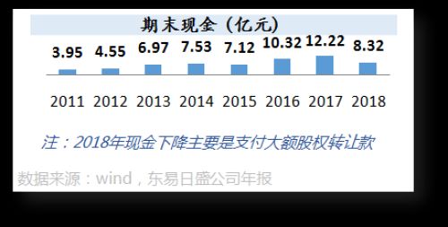 从数据上我们可以看出,除却外部因素,东易日盛在2011年-2018年期间的期末现金基本上处于一个稳定上升的趋势,这说明东易日盛主营业务盈利能力强,现金流是十分充沛的。国外企业例如苹果、可口可乐、沃尔玛、亚马逊正是因为非常出色的现金流收到了巴菲特的青睐,国内企业除东易日盛外,新城控股、中国联通、融创中国等也有着相当不错的现金流。