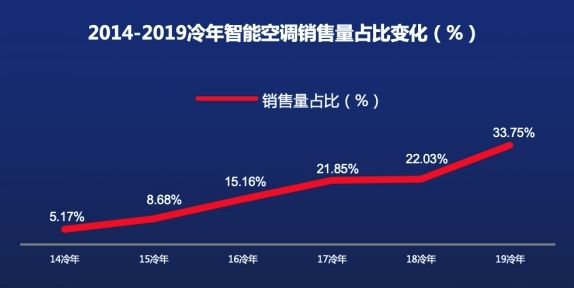 由海尔在2010年提出和实践的智能空调,从2016年开始实现销量的快速提升,2019冷年虽然整体市场情况不好,但基于海尔“智家云”的战略布局,智能空调却在重点城市销量实现了同比增长33.75%,和2018冷年相比,增幅将近11个百分点,可以说,2019冷年,是智能空调发展的“大年”。