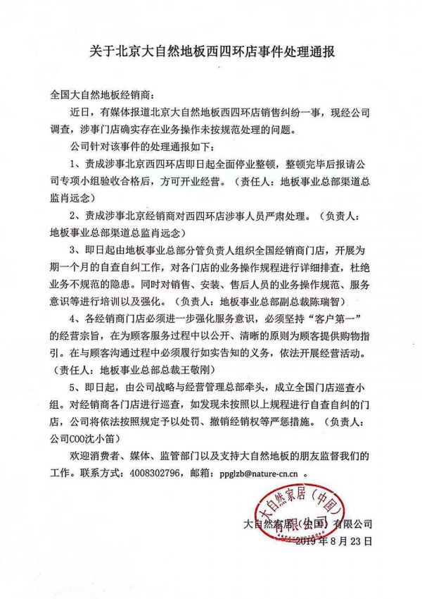 8月23日,针对北京大自然地板经销商门店发生的售后纠纷事件,大自然地板在其官方渠道@大自然家居官方微博发布《关于北京大自然地板经销商门店事件的中的致歉信》。