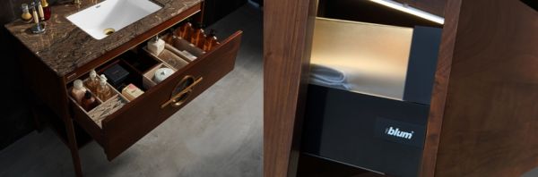 例如浴室柜的五金配件,虽为“配角”,但蒂高一点都不放松。蒂高仿古柜的拉手和五金合页,全部采用奥地利百隆五金进行搭配,反复斟酌挑选,甚至自主开发,直至找到适合的五金和搭配色系。