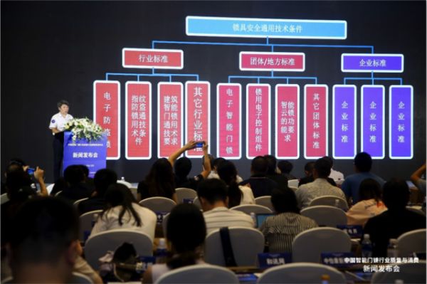 发布会现场,中国日用五金技术开发中心主任兼全国五金标准化技术委员会日用五金分技术委员会主任委员毕智涛就智能门锁现行国家标准、行业标准和团体标准进行解读。
