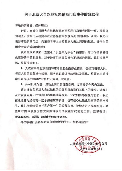 据了解,自成立以来一直秉承“以客户为中心”的宗旨,着力为消费者提供更好的产品和服务的大自然地板,对于涉事门店业务操作不规范的问题,该家企业提起高度重视,以诚挚的态度,坚定的决心,马不停蹄的办事效率,连夜调查清楚事件的始末,发现问题后,立即着手处理,同时第一时间官方致歉,发布《关于北京大自然地板经销商门店事件的致歉信》。