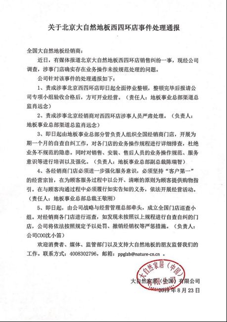 在该致歉信中,大自然地板严惩涉事门店,并下令对其进行严肃的整顿,整顿措施如下: