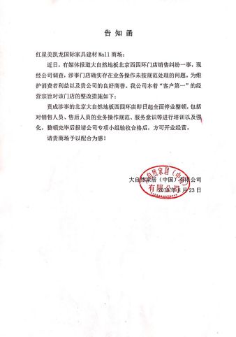 与此同时,大自然地板对该涉事门店所在的当地红星美凯龙国际建材Mall商场发出了诚挚的告知函,列明了大自然地板将针对近日的门店销售纠纷一事进行的相关整顿措施。
