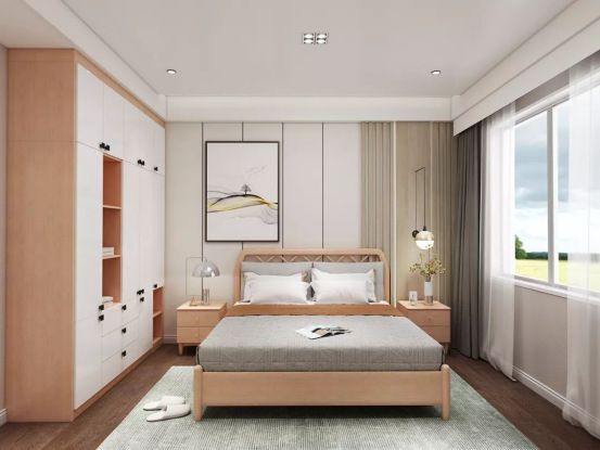 次卧采用弧格尔系列床及同风格定制衣柜,简约、圆润、亲和、灵巧,静卧在此,让人感受到无与伦比的舒适与自在。