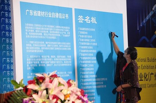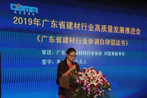 会上,广东省建筑材料行业协会秘书长刘莲香代表广东建材各大协会宣读了《广东省建材行业协调自律倡议书》,呼吁在广东建材行业内开展行业自律,顾全大局,勇于承担责任,树立正确的行业导向,引导广东建材行业形成健康、稳定发展的有效机制。