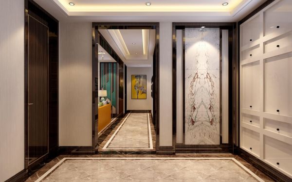在进入客餐厅的垭口处用不锈钢收边,右侧立面加设大理石造型墙,它的纹路跟随着顶面射灯的光路向下延展,好似被船桨荡起的水波,从平静湖面破开一道口子,造型激荡又富有美感,给新家奠定了优雅基底。