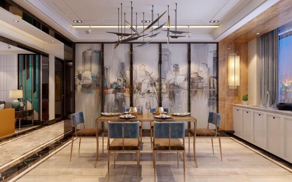餐厅里最引人入胜的应该是它的背景墙设计。这幅拼接式墙布画的是水墨笔下的城市剪影,清一色的灰,零星处点缀蓝、橙等修饰色,把城市的繁华与冷漠展露无遗。细看时又觉得它画的是江南水乡,小舟轻泛湖上,好不惬意。
