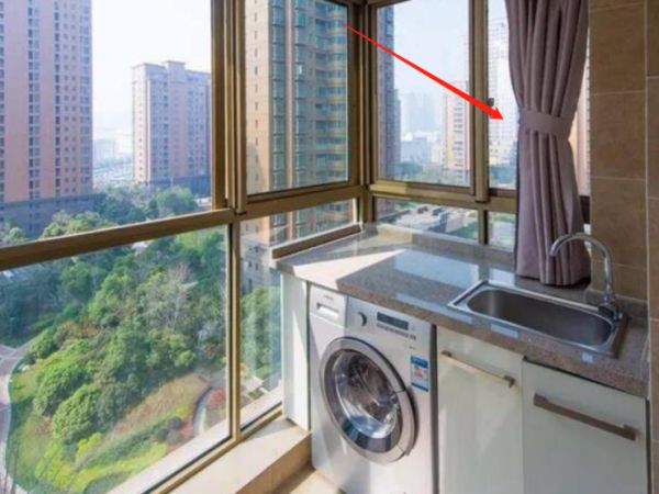 但还得注意,正是由于阳光长时间暴晒,对于洗衣机和柜子是没有好处的,所以应该在阳台加带有遮光效果的窗帘。