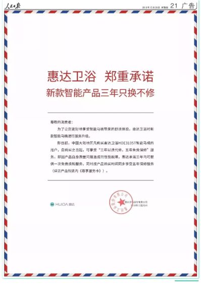 2018年年底,惠达卫浴针对新款智能马桶HDE3105T推出了“三年以换代修,五年免费保修”的服务承诺。在2019年上半年,卫浴行业营销案例中,惠达的“只换不修”承诺算得上是最具有看点的了,其持续被消费者刷屏也让各界见证了惠达卫浴的高品质。