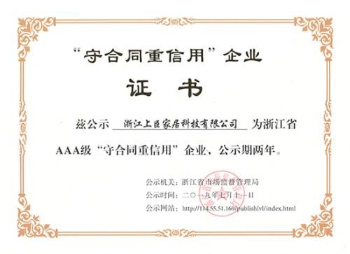 上臣公司顺利通过浙江省市场监督管理局严格的资格审核、合同和信用情况测评、无违法违规行为及实地抽查审议,获得浙江省AAA级“守合同重信用”企业荣誉称号。