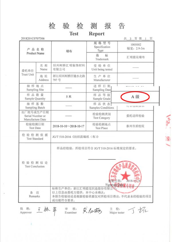 此外,汇明A+墙布在《JG/T 510-2016 中华人民共和国建筑工业行业标准》的全项质检中,以远低于国家标准限值的优质产品获得合格检测报告,是值得消费者信赖的墙面装饰产品。此标准检测是指由中国建筑装饰装修材料墙纸分会发布的,适用于以天然植物纤维或纺织物为面层,纸或布及其他复合材料为基底的室内墙面装饰物的检测。