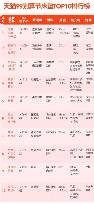 2019天猫99划算节床垫TOP10,哪款最值得买?