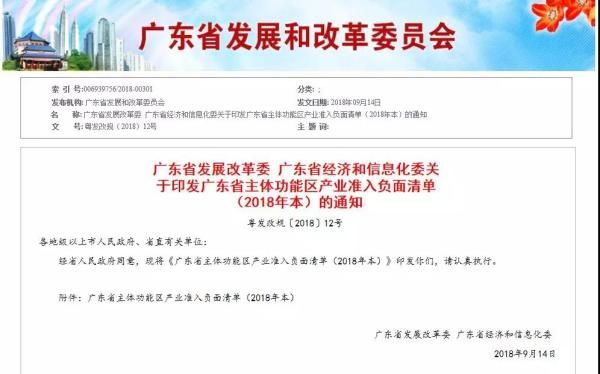 2018年9月14日,广东省发展改革委、广东省经济和信息化委联合印发“广东省负面清单”,该清单按照主体功能区分类,包括:重点开发区、优化开发区、生态发展区、禁止发展区,具体要求: