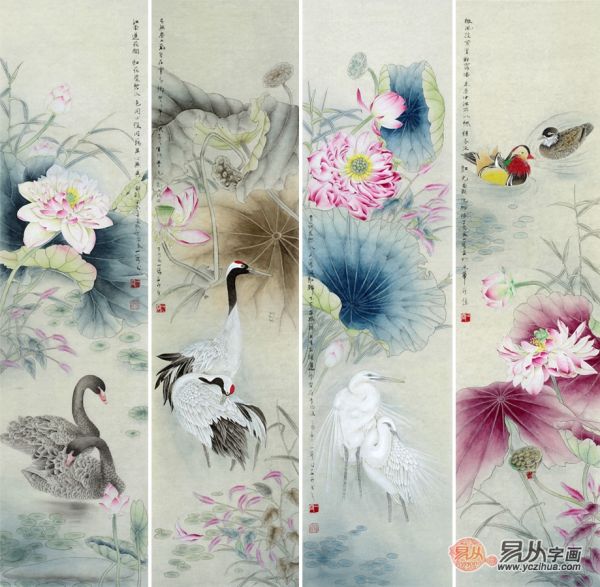 王一容老师这幅四条屏中中画有荷花分别于鸭、仙鹤、白鹭、鸳鸯等传统吉祥图案组合在一起,四幅作品笔法工整、细腻,荷叶色彩变化丰富、清晰自然、形态惟妙惟肖。荷花,一直是清高的象征,花叶清秀,纯洁典雅,花香四溢,沁人心脾,自古就受到人们的喜爱和追捧,给人以精神上的享受和带来视觉上的美感。又因它清香久远,秀雅清香,寄托着人们心中洁身自爱、不同流合污的高洁追求。荷花也是莲花,寓意连年有余、和和美美、和气生财,也有祝家庭和睦、和顺等,作为家居装饰画是一个不错的选择。