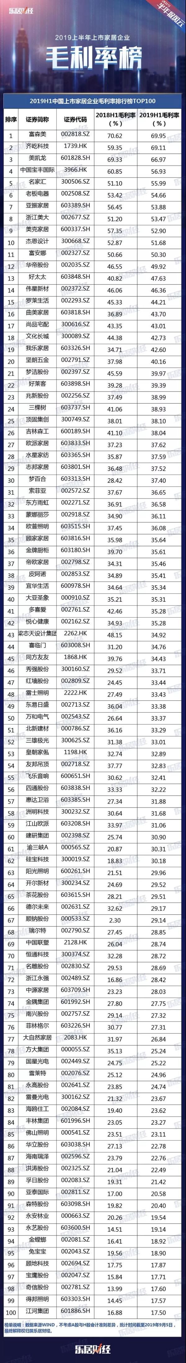 截至9月5日,除去敏华控股、航标控股等少数几家企业,中国上市家居企业2019半年度报告基本披露完毕。半年报收官之际,乐居财经挑选了100家主流上市家居企业,整理其2019上半年毛利率数据,并发布了《2019H1中国上市家居企业毛利率排行榜TOP100》。