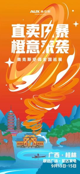 9月13日至15日,奥克斯空调 “直卖风暴”线下巡展即将登陆桂林,品牌将再次用自己的方式,为年轻的朋友们送去一份欢乐。