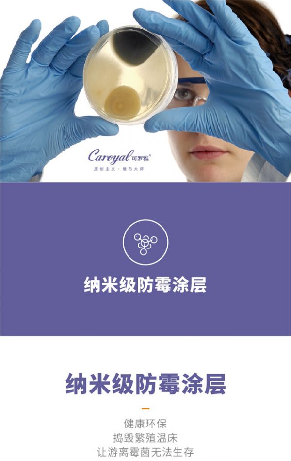 可罗雅墙布采用纳米级防霉涂层,健康环保,捣毁繁殖温床,让游离霉菌无法生存!