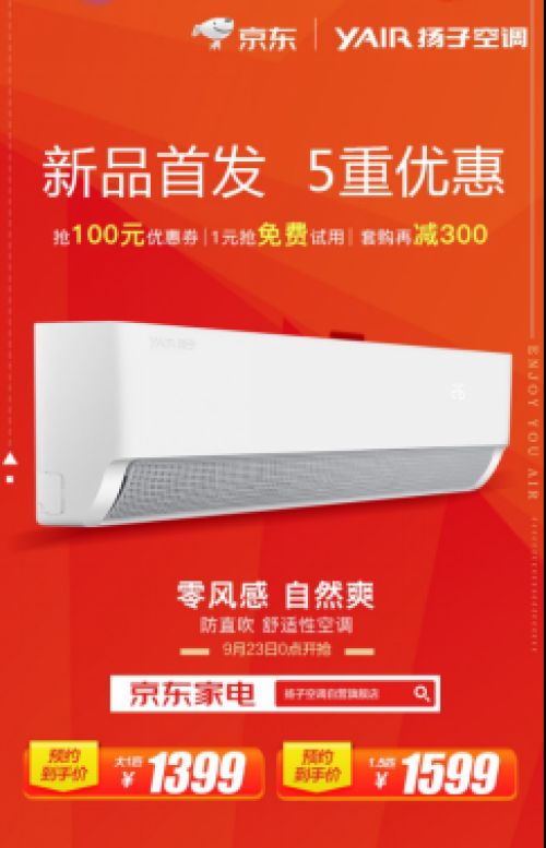 9月12日,继扬子空调首款反向定制的零风感空调后,基于京东消费大数据反向定制的扬子空调第二款反向定制的零风感空调在京东震撼首发、启动预约,23日0点正式开售,抢购价1399元!9月12-22日期间,每天100元优惠券限量抢,关注店铺抽取1元试用资格。该空调是京东家电与扬子空调强强联手打造的又一款京品家电力作,进一步挖掘用户使用空调槽点,为用户打造“零风感”的舒适性体验。