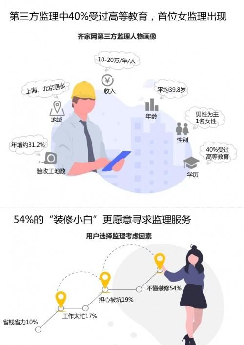 9月10日,齐家网联合腾讯家居、优居新媒体发布了《2019年互联网家装用户洞察白皮书》,白皮书显示,2019年齐家网平台上第三方监理验收工地数量年增约31.2%,在以男性为主的行业中,首位女监理出现。他们的平均年龄为39.8岁,40%受过高等教育,平均年收入达10-20万/年/人。