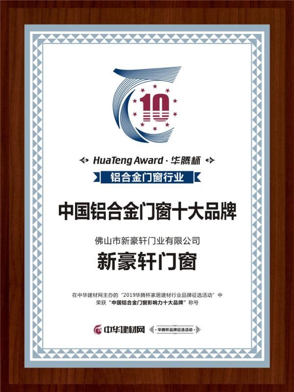 在刚刚结束的2019华腾杯“中国铝合金门窗十佳品牌、中国铝合金门窗十大品牌”网络评选活动中,新豪轩门窗凭借强大的品牌实力以及良好的市场口碑,一路过五关斩六将,成功赢得了“2019中国铝合金门窗十佳品牌 ”“2019中国铝合金门窗影响力十大品牌”双重荣誉。
