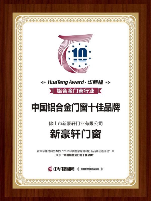 新豪轩门窗荣获“2019中国铝合金门窗十佳品牌 ”