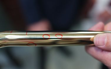 即使幸运地过了灌浆这一关,零部件到了火眼金睛的质检部,仍然难逃法眼。工作人员解释说铜管上画圈圈的地方代表有问题,大家拿起“问题部件”,在灯光下紧盯着看了足足一分钟,才发现了极其细微的小颗粒,调侃THG Paris的审查简直是“吹毛求疵”。