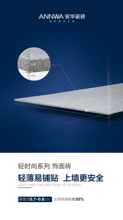 安华瓷砖轻时尚饰面砖将“轻薄”进行到底,看似随意的厚度却都是认真仔细的考量。为了能让瓷砖更容易的铺贴上墙,轻时尚饰面砖厚度仅0.7-0.8CM,比传统瓷砖薄了30%,如此的“轻”是为了让瓷砖更容易与墙壁贴合。轻薄的“外在”不仅强化了铺贴后的平整度,使得铺贴起来更整洁美观,还减少了后期容易变形带来的二次麻烦,“往上爬”可以使得墙壁光滑灵动,“往下走”亦可以使的地板大气磅礴,无论是那种铺贴都能轻松驾驭!