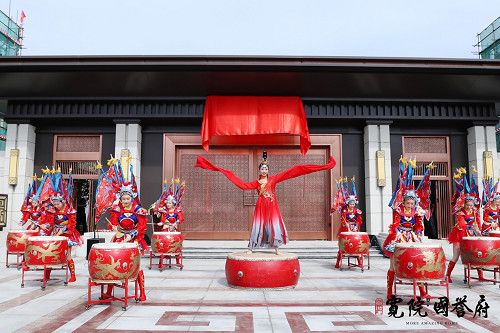 盛会当天,一曲激情昂扬的盛世鼓舞为盛会惊艳启幕,铿锵有力的激情鼓点、大开大阖的唐韵风情,彰显了宽院•国誉府旗开新国门、升级人居的恢弘气魄。