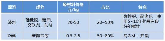 市面上销售的硅酮密封胶,一般液料占比20%-50%不等,粉料占比50%-80%,不同厂家的产品差异较大。