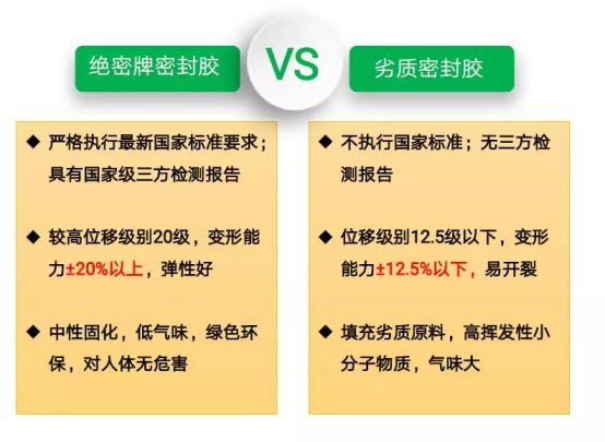 劣质密封胶特点:填充劣质原材料,高填充粉料(70~80%以上),弹性差,易老化开裂、脱粘。