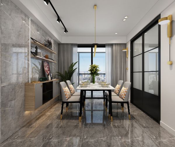 2、这个属于独立的餐厅,墙面采用了灰色条纹瓷砖配上黑白的餐椅桌呈现出独特的品位。顶上有一盏独特精致的吊灯配上一个大落地窗,使人感觉到很雅致,让人愉快的用餐同时还能观看窗外的风景。