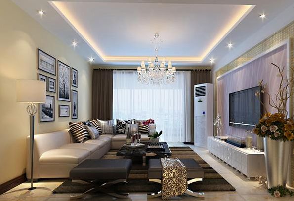 1、整个客厅使用了暖色调进行色彩搭配,配上毛绒的地毯,整体的感觉非常别致。客厅的面积虽然不大,但是看起非常的宽敞,米色的沙发,在搭配上简约造型的茶几,使整个客厅显得格外宽敞又大气。吊顶采用了暖色的射灯以及一盏吊坠的水晶灯显得高雅和精致感。