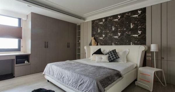 3、对墙面装饰不同的设计,体现出卧室的属性。卧室的主人将房间以灰色为主,配上浅白灰原木地板,灰白色的床上用品,一张床头柜合成的小台灯显示出简洁大方。