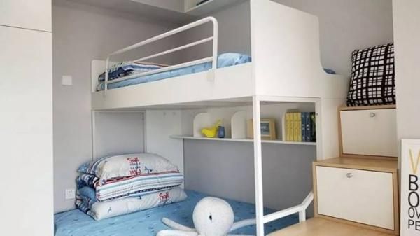 虽然家里只有一个孩子,却把儿童房做成上下床铺。原因是未来长辈们将会一起住。毕竟,共享天伦之乐是每个家庭的期盼。上下床、书柜、阶梯柜一体化设计,造型格局错落有序。即使是小空间,也不觉得拥挤。书桌位于飘窗位置,学习时有明亮光线,清晰不伤眼。男孩性格活泼开朗,酷爱科幻。所以在儿童房的装饰中添加了不少有关科幻元素的东西,深得孩子喜欢。