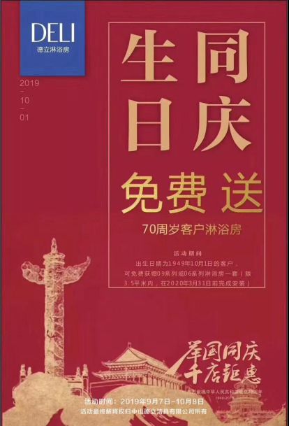 9月7日-10月8日活动期间,出生日期为1949年10月1日(以身份证日期为准)的客户,可免费获赠09系列或06系列淋浴房一套(限3.5平米内)。需本人携带身份证原件到门店打卡拍照并发朋友圈,另需提供卫生间平面户型图、卫生间设计效果图(门店设计师完成)并在2020年3月31日前完成安装。
