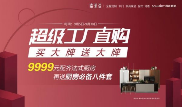 中秋已过,国庆将至,在竞争愈演愈烈的家居市场中,司米橱柜深度紧绑与家电巨头品牌的跨界合作。在9月5日-9月30日开启「超级工厂直购」活动,以工厂直购价格,给消费者带来优质橱柜,更送厨房必备八件套,满足消费者对厨房装备一步到位的需求。