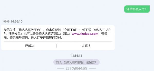 亿欧家居随即登陆了修达达官网,网站显示“当前无在线客服”,而网站显示的客服热线处于无人接听状态。亿欧家居尝试在网站下单,订单正常生成后进入“师傅报价”状态,随后,一位相关维修师傅接单并提出报价,但目前未收到平台相关客服询问订单信息。