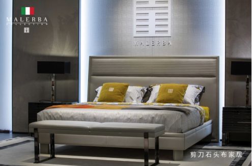 MALERBA双人床,依旧是简约大方的设计造型,配以明亮色彩的床品,以全牛皮做为整体软包材料,床背上纵横线条便无再多的装饰,用极简大气的现代风格,为都市客人追求极致舒适、寻求心灵平静的理想家居空间。