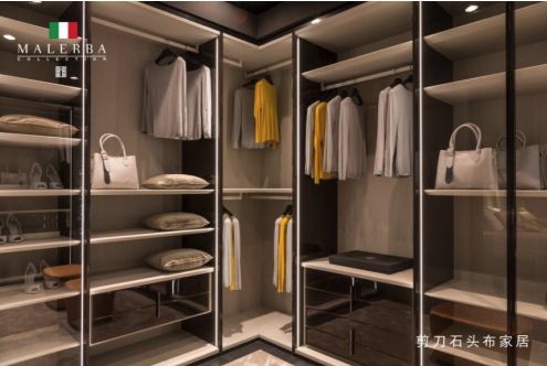 与众多意大利进口家具相比,MALERBA拥有独家“高级定制衣帽间”服务。高光亮漆木饰面加上牛皮软包,嵌入金属边条做为装饰,利用多元化的材料,几何与对称的精巧细致,将艺术和功能完美融合为一体,呈现秩序美感和奢华风格的结合。